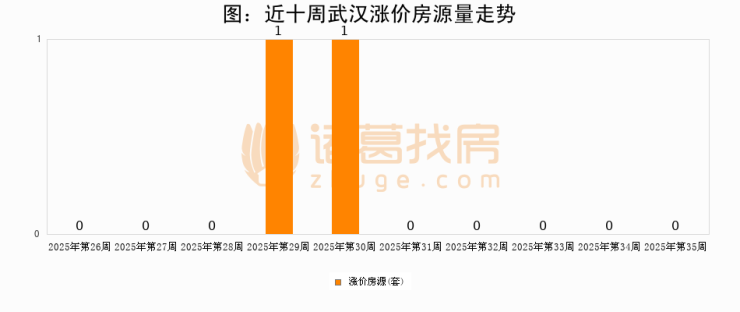 从调价房源来看,第35周武汉涨价房源0套,较上周持平。与此同时,35周涨价房源占比持平