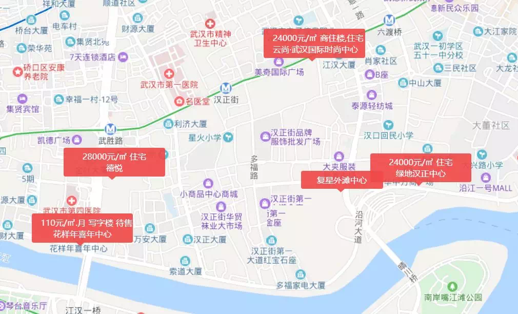 汉正街片区在售楼盘有绿地汉正中心、禧悦、云尚武汉国际时尚中心等。均价27000-35000元/平米之间。