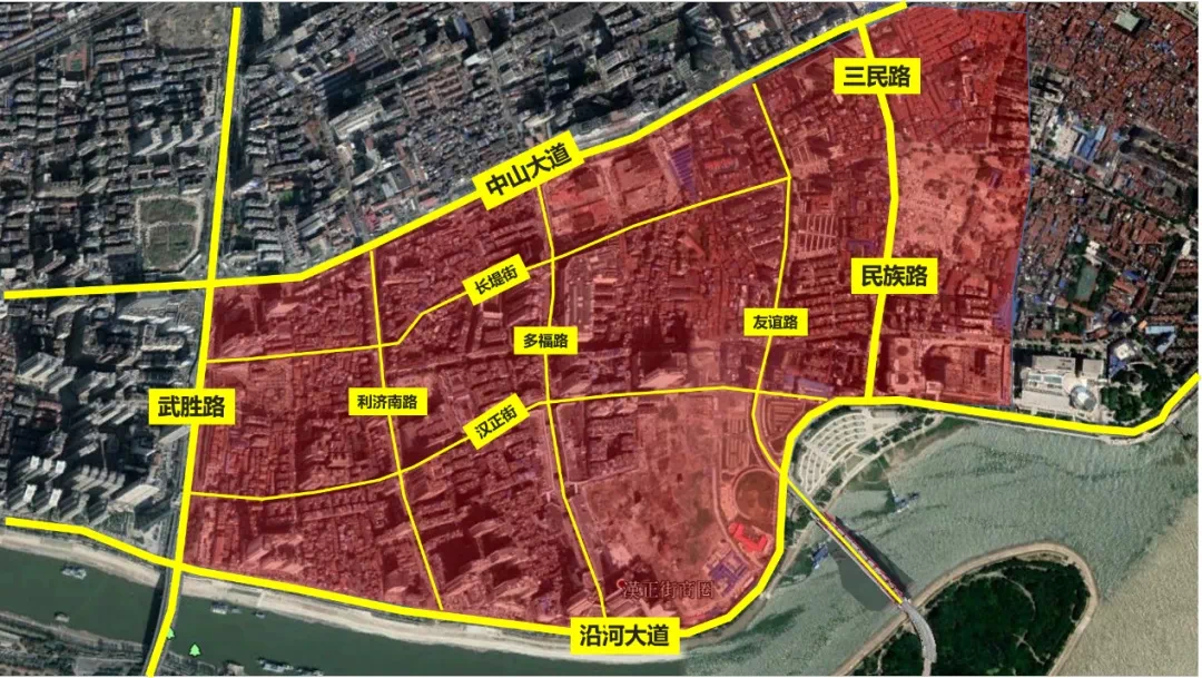 东起江汉区的三民路、集家嘴,西到硚口区的武胜路,南临汉口沿河大道,北至中山大道,由汉正街、长堤街等78条街巷组成,占地2.56平方公里,含有6个街道办事处的行政区划。