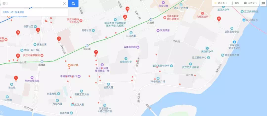 在百度地图中,汉正街区域的银行网点出现了137个搜索结果,涉及至少16个以上的商业银行品牌。汉正街确实是离“钱”很近的地方,可以说是武汉市现金交易最为密集的区域。