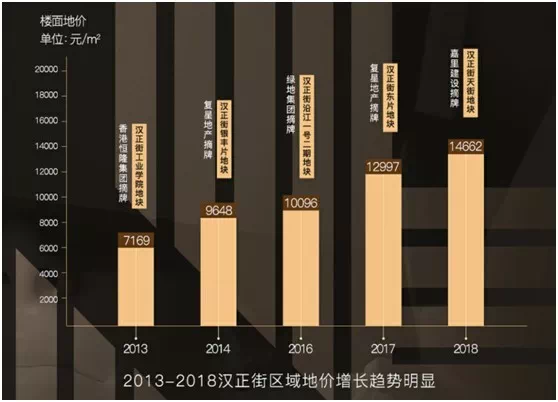 汉正街板块5年间楼面地价涨幅超过200%,2018年嘉里建设摘牌汉正街东片地块,楼面地价高达14662元/平米。