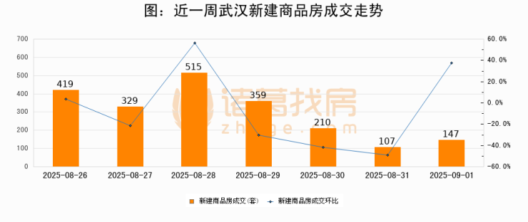 根据武汉市住房保障和房屋管理局数据显示,2025年09月01日武汉新建商品房成交147套,较昨日增加40套,环比上涨37.4%。近一周武汉新建商品房日均成交298套。09月01日单日成交147套,低于近一周平均水平50.7%。