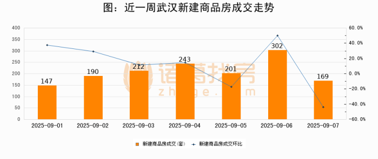 根据武汉市住房保障和房屋管理局数据显示,2025年09月07日武汉新建商品房成交169套,较昨日减少133套,环比下降44%。近一周武汉新建商品房日均成交210套。09月07日单日成交169套,低于近一周平均水平19.5%。