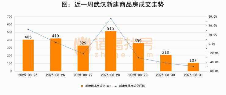 根据武汉市住房保障和房屋管理局数据显示,2025年08月31日武汉新建商品房成交107套,较昨日减少103套,环比下降49%。近一周武汉新建商品房日均成交335套。08月31日单日成交107套,低于近一周平均水平68.1%。