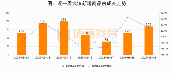 根据武汉市住房保障和房屋管理局数据显示,2025年08月19日武汉新建商品房成交169套,较昨日增加40套,环比上涨31%。近一周武汉新建商品房日均成交145套。08月19日单日成交169套,高于近一周平均水平16.6%。