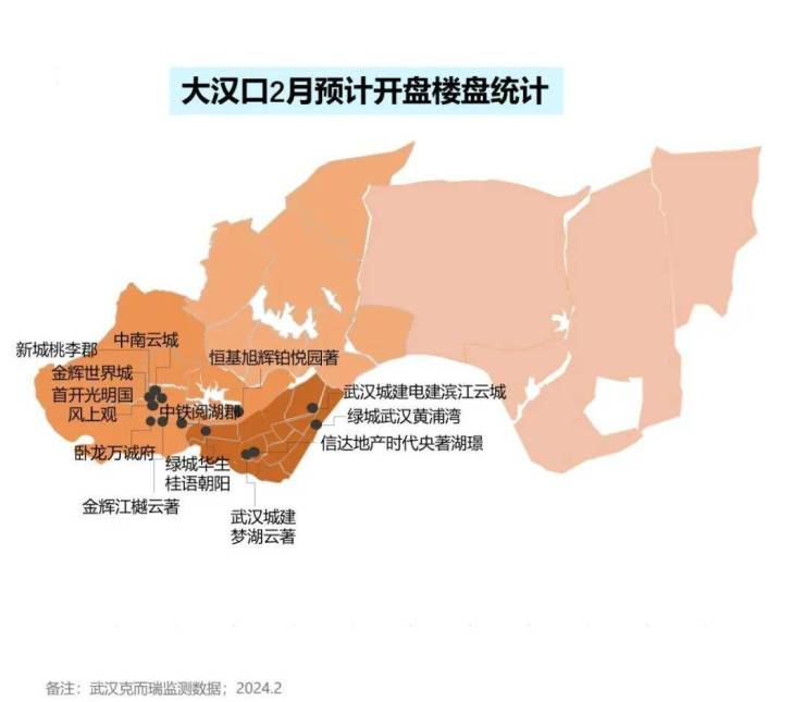 根据克而瑞监测数据,2024年2月,武汉市预计26个项目有供应,总供应量56.5万方,总房源4615套。其中6个为纯新盘,5个位于大武昌。