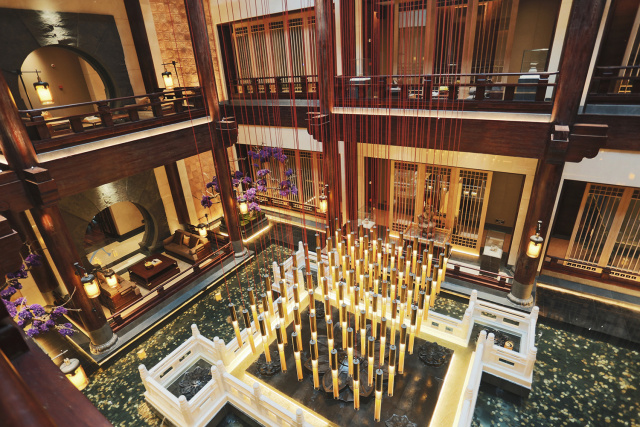 酒店的设计师在这里呆了整整七年,他从盛唐的宫殿和道观素材中汲取灵感,运用玉石、琉璃、贵木这些美轮美奂的建材,着墨于道家的经典莲纹意象,从建筑到装饰都流露出他的美学观与生活态度。