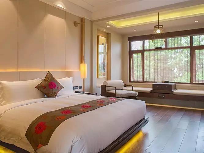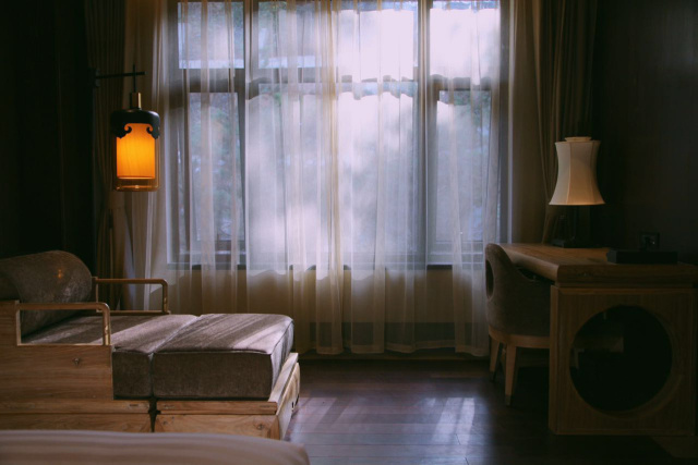酒店的客房共95间,主要分布在明华、迎阳、长汤、紫极四苑中。较早开放的一批客房位于迎阳苑,棉麻与浅色木材的运用打造了一个归园朴居,高山仰止,景行行止。