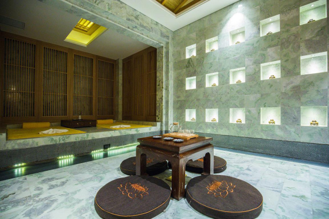 圣智堂 ,环境私密的SPA理疗区,延续着唐朝的养身之道,外谈水浴,内谈茶经。