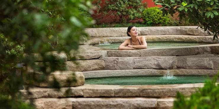 骊山温泉曾被誉为“天下排名前列御泉”,古代是帝王的专享。酒店借着地理之利,引流淌过盛世长安的6000温润之水入宝积池中,注满16个室外汤池,汤池以大理石为侧壁,以墨玉为底,不规则地分布在山间花草中。