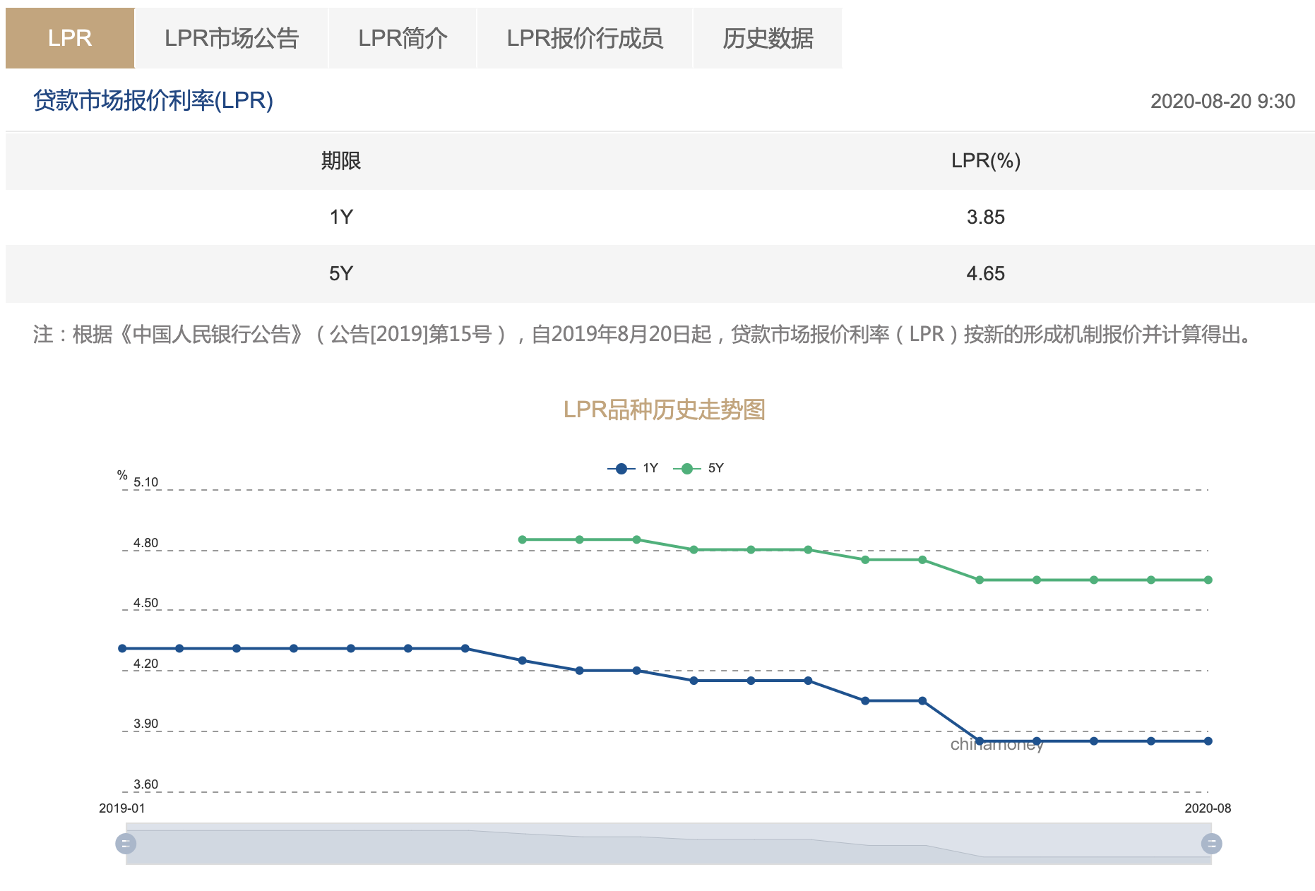 8月20日,8月LPR利率报价出炉:1年期利率报3.85%,5年期以上利率报4.65%。