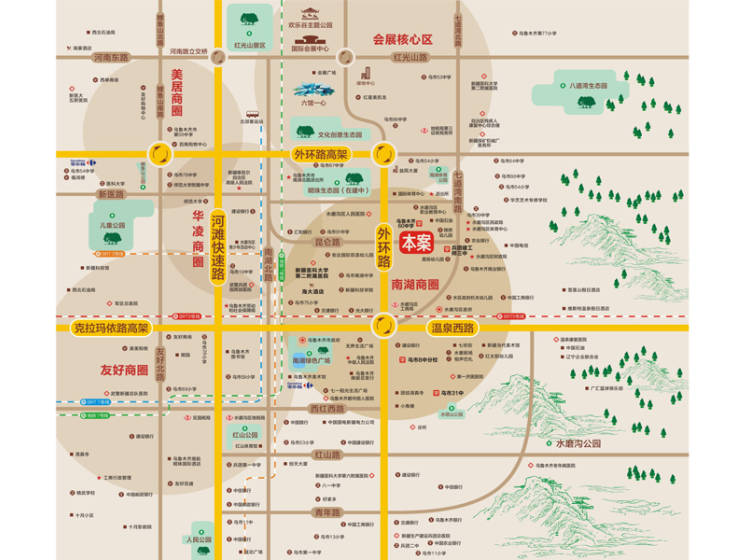 (交通)通过门口的外环路,从多个方向出行,1分钟上外环,向东走温泉路5分到水磨沟风景区,向西走克南高架10分即可到达友好商圈,南湖市政府,家乐福超市,向北走会展5分钟即可到达会展中心红光山景。如果选择绿色出行的话,10多条公交路线(包括901、913、914、505、502、535、3、58、62、35,56,105)。