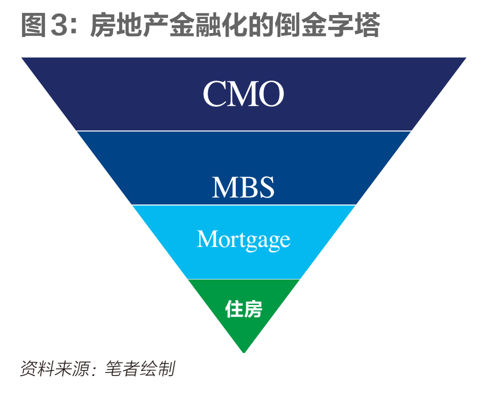 房地产的金融化形成了图3这样的倒金字塔结构,最底层的资产是住房,其中有很大一块比例是通过向银行申请贷款购买的,这就形成了银行的抵押贷款(mortgage)。