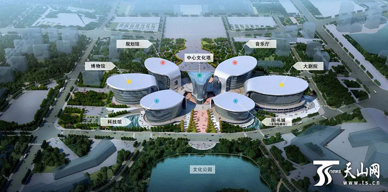 据了解,乌鲁木齐市文化中心包括大剧院、音乐厅、图书城、科技馆、规划馆、博物馆六个单体和中心文化塔,整个建筑看起来犹如一朵盛放的雪莲,象征团结、和谐、繁荣。