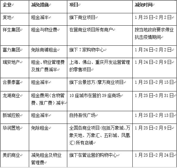 同日,还有部分房企更进一步提出在一定期限内免除租金。其中,富力提出免除自1月24日起10天内旗下7家购物中心商铺的租金;祥生集团对在营商业项目所有商户在防治疫情特殊期间的租金及物业费全免;爱琴海集团决定对旗下全部商户在一个月内减租金及物业费。