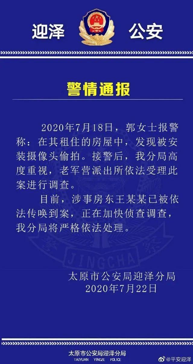 太原市公安局迎泽分局7月22日发布警方通报,称涉事房东王某某已被依法传唤到案,正在加快侦查调查,将严格依法处理。