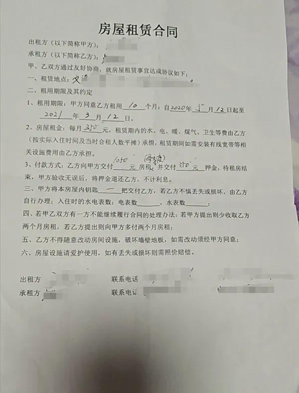 她提供的两张房屋租赁合同显示,她从今年3月起租该房,短租1个月;随后又续租到2021年3月12日。每月租金350元。出租方为王某某。