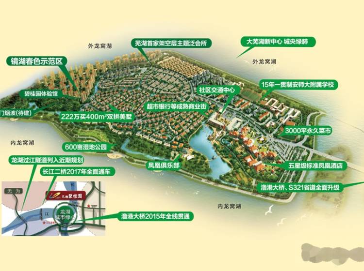 芜湖碧桂园位于三山区龙窝湖旁,项目总占地2908亩,规划总户数10000户,属于 重点发展的龙窝湖旅游度假项目,是芜湖市区中环境优美,自然水资源得天独厚的江岸社区。 项目所在地拥有芜湖市区 的水景资源——两个均过万亩的内、外龙窝湖和芜湖市区内近乎宽阔的长江美景, 600亩湿地公园。芜湖碧桂园总体规划坚持“以人为本”的规划原则,注重生态设计,合理地利用了区域的水景资源,创造出多层次的生态型园林绿化体系,同时在设计中还引入高尔夫绿化设计理念,结合了的水自然元素,让建筑与层次丰富的绿化生态体系优质结合。 芜湖碧桂园产品规划有水岸花园美墅、阳光亲邻美墅、优雅花园洋房等,建筑设计博采 上经典别墅建筑的精华,亦融合众多碧桂园产品中受欢迎的经典户型,外观为极具阳光感的地中海风格,能满足不同类型客户全方位、多系列的居住需求,同时项目规划有大型商业广场及完善的 体系等健全的高尚生活配套设施。
