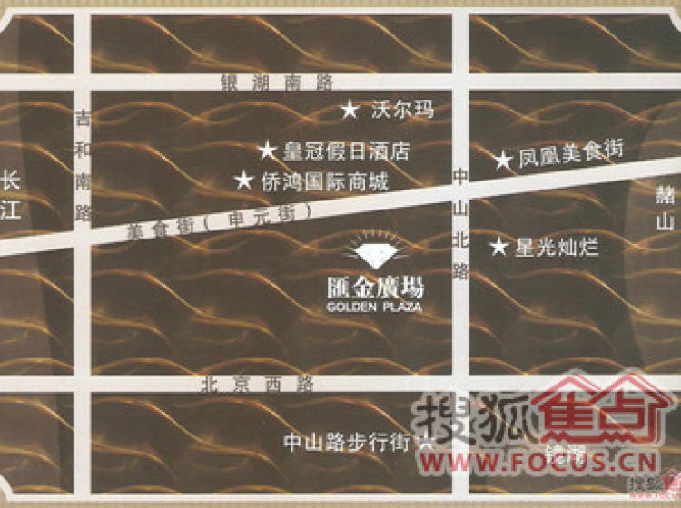 汇金广场,位于中山北路与申元街交汇处,占地面积10000平方米,总建筑面积70000平方米。项目西侧600米即为长江,东侧为大小赭山,南侧距全国著名的大小镜湖、鸠兹广场、中山路步行街仅数百米之遥,雄踞芜湖高级商圈,扼中山北路和凤凰美食街之咽喉,周边侨鸿国际购物中心、皇冠假日酒店、沃尔玛、星光灿烂等众星拱月,形成以汇金广场为中心的城市CBD核心区域。乘坐1、3、8、18、23、24、38、43、103路公交车均可到达,交通方便。