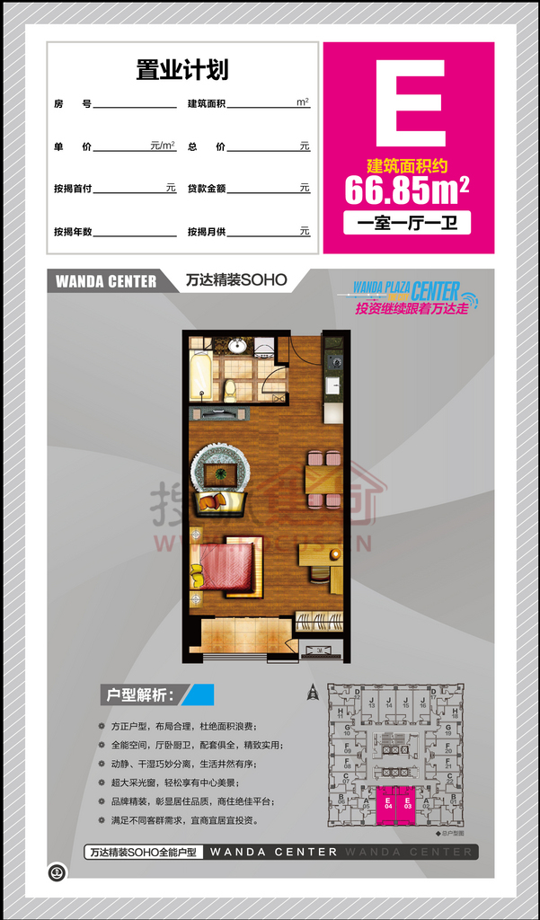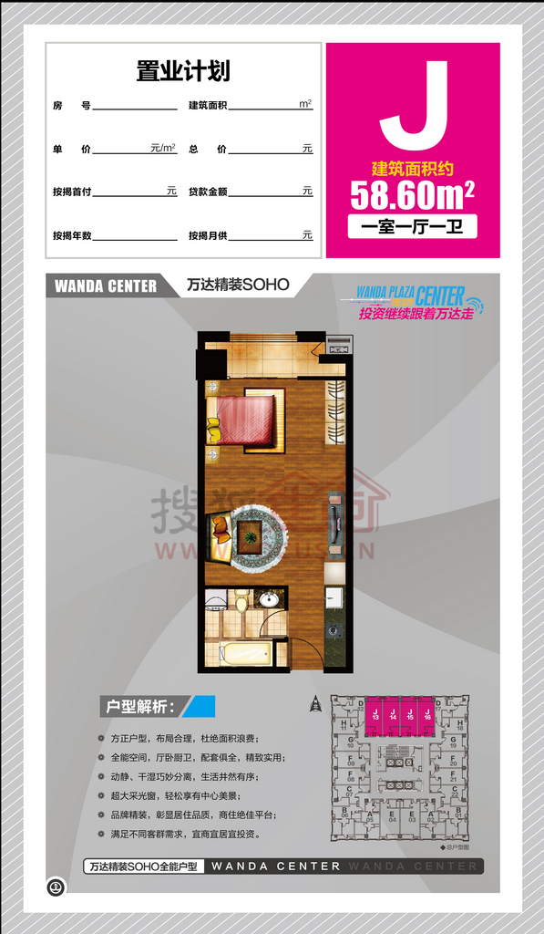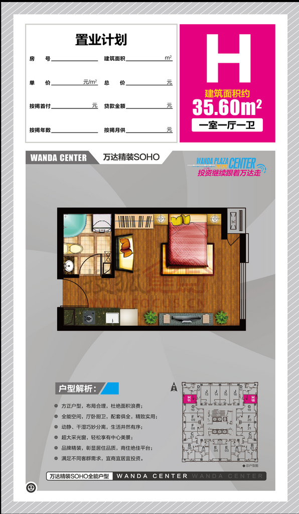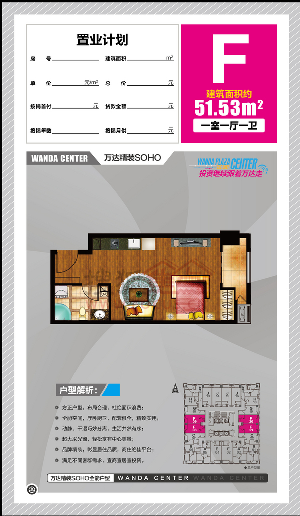 万达中心,是万达集团旗下的鼎尖商务产品,以高端定位、国际配套和先进品质铸就芜湖首席商务平台,于此荣启芜湖万达中心全能商务时代。万达中心,作为万达广场二期鼎尖产品,傲立于城市首席综合体镜湖万达广场之南,享一期30万㎡醇熟商业氛围,揽二期22万㎡商务特区配套,星级化、多角度地为芜湖奠基国际高级中心商务运作平台。万达中心,为再一次改变芜湖而来。十项全能商务系统晋升高效商务通路,以同步国际的商务标准,铸就芜湖鼎级写字楼商务标杆。
