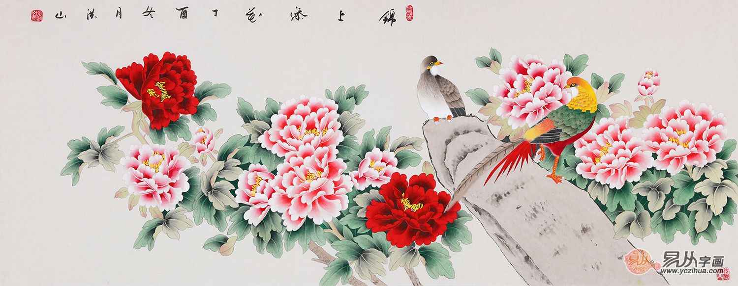 张洪山六尺横幅牡丹锦鸡图《锦上添花》(作品来源:易从网)