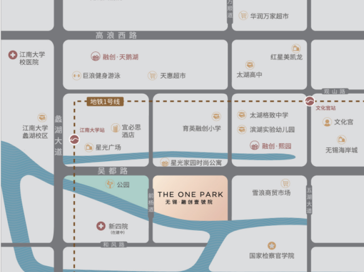 周边教育有完善的教育设施滨湖实验幼儿园、待建幼儿园,育英融创小学、太湖格致中学、江南大学等,发达的购物商城海岸城、万象城、博大假日广场、星光广场,中国招商银行、中国建设银行等,完善的医疗设施新四院(在建中)、第二中医医院,大面积的公园占地长广溪湿地公园、金匮公园、尚贤河湿地公园、雪浪公园、市政公园等是生态宜居之地。