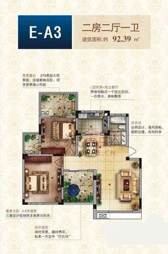 2室2厅1卫-蓉湖山水 二期翠庭洋房户型 情景洋房 2室2厅1卫92.39㎡ E-A3户型