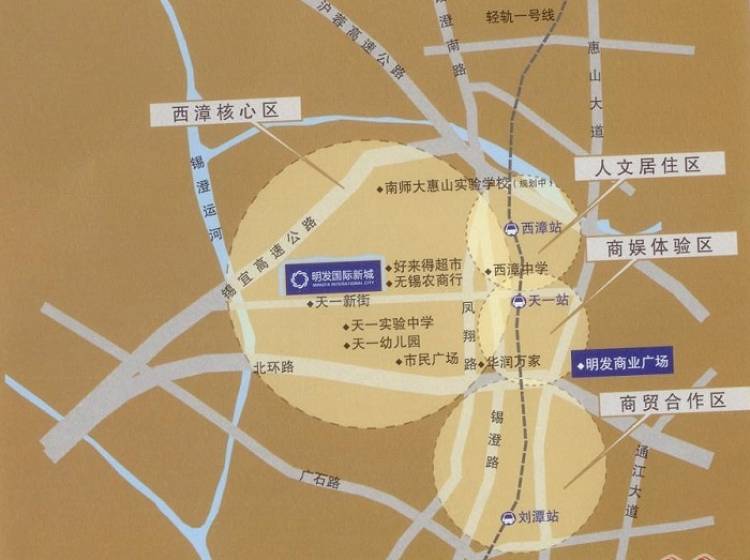 明发国际新城位居惠山区堰桥街道西漳社区,南至天一街、东临天水路、北至西漳路。地铁1号线、凤翔路、北环路、沪宁高速、锡宜高速和在建的京沪高铁等城市交通汇集。