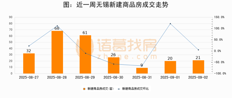 根据无锡市房地产市场管理和监测中心数据显示,2025年09月02日无锡新建商品房成交21套,较昨日增加1套,环比上涨5%。近一周无锡新建商品房日均成交34套。09月02日单日成交21套,低于近一周平均水平38.2%。