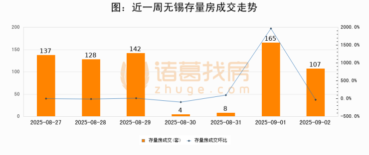 从存量房来看,2025年09月02日无锡存量房单日成交107套,比昨日减少58套,环比下降35.1%。从近一周存量房成交来看,无锡存量房日均成交套数为98套,09月02日单日成交107套,高于近一周平均水平9.2%。