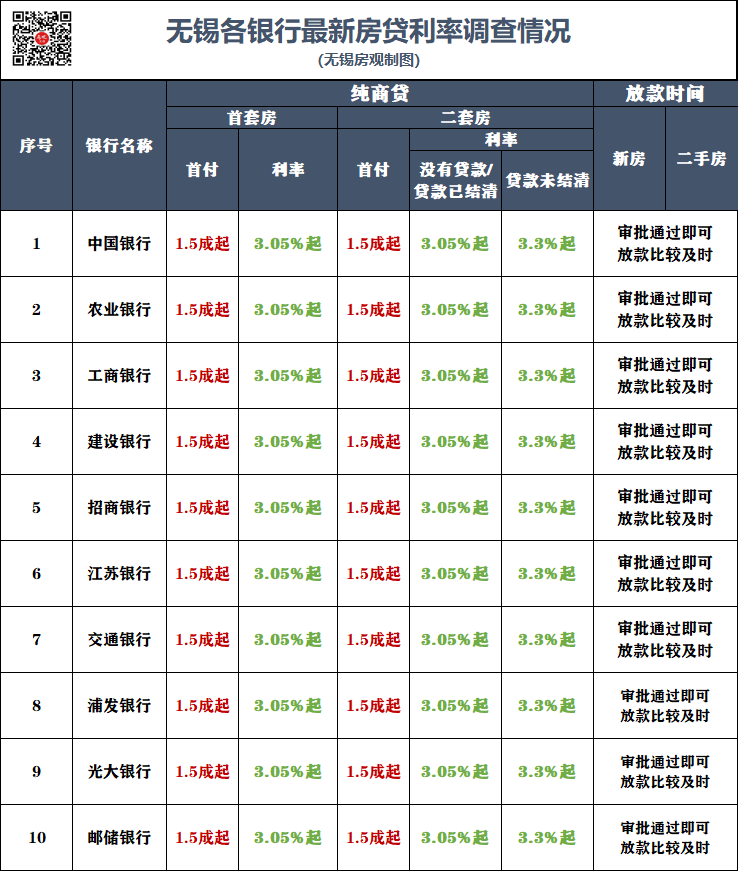 同步跟进无锡最新的房贷利率,目前,无锡多家银行首付比例1.5成起,新发放房贷款利率3.05%起;二套首付1.5成起,首套贷款未结清,利率3.3%起(组合贷商贷部分利率与纯商贷利率一致);各家银行额度充足,放款比较及时。