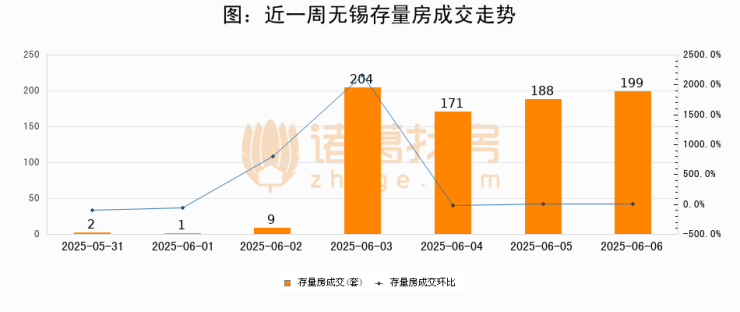 从存量房来看,2025年06月06日无锡存量房单日成交199套,比昨日增加11套,环比上涨5.9%。从近一周存量房成交来看,无锡存量房日均成交套数为110套,06月06日单日成交199套,高于近一周平均水平80.9%。