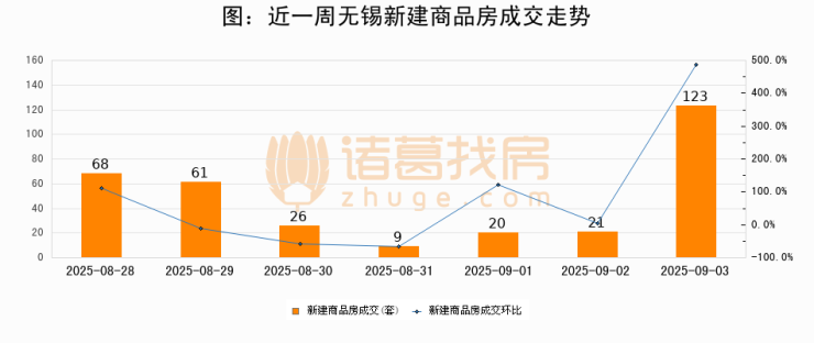 根据无锡市房地产市场管理和监测中心数据显示,2025年09月03日无锡新建商品房成交123套,较昨日增加102套,环比上涨485.7%。近一周无锡新建商品房日均成交47套。09月03日单日成交123套,高于近一周平均水平161.7%。