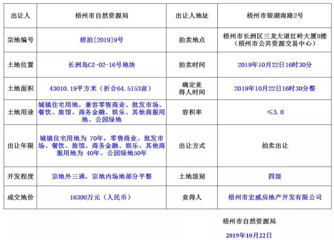 去年10月22日,长洲岛占地64.5亩的CZ-02-16号地块被梧州市宏威房地产开发有限公司以1.63亿元拿下。