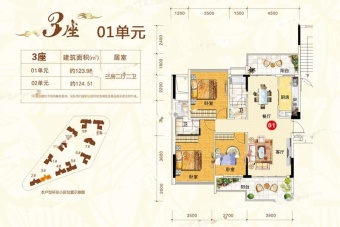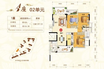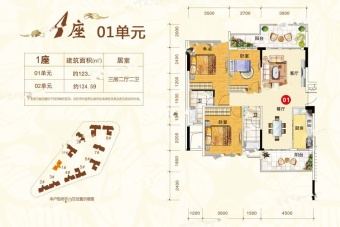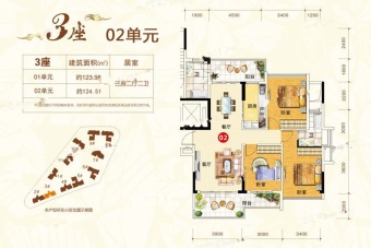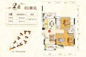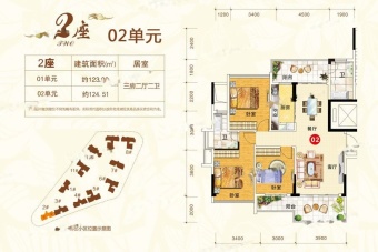 [1/2/3座共54套,123/124㎡纯板式一字楼,开盘均价4500元/㎡,一梯两户,10层高]
