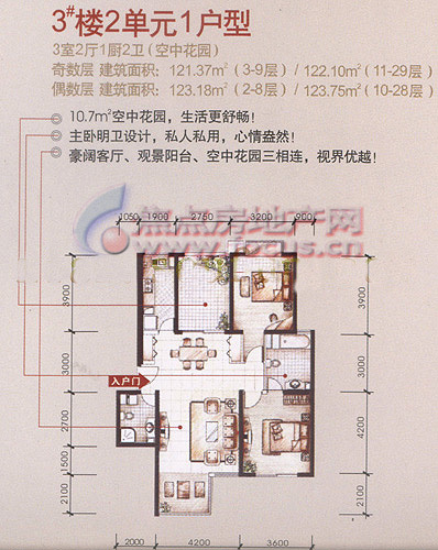 3号楼2单元3室2厅2卫奇数层122.10平米(11-29层)