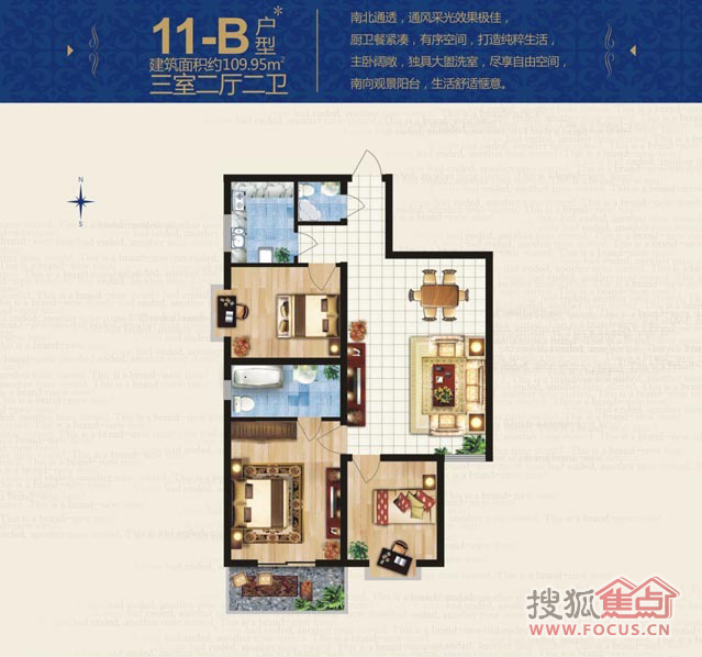 3室2厅2卫-澜岸11号楼B户型3室2厅2卫1厨109.95平米户型