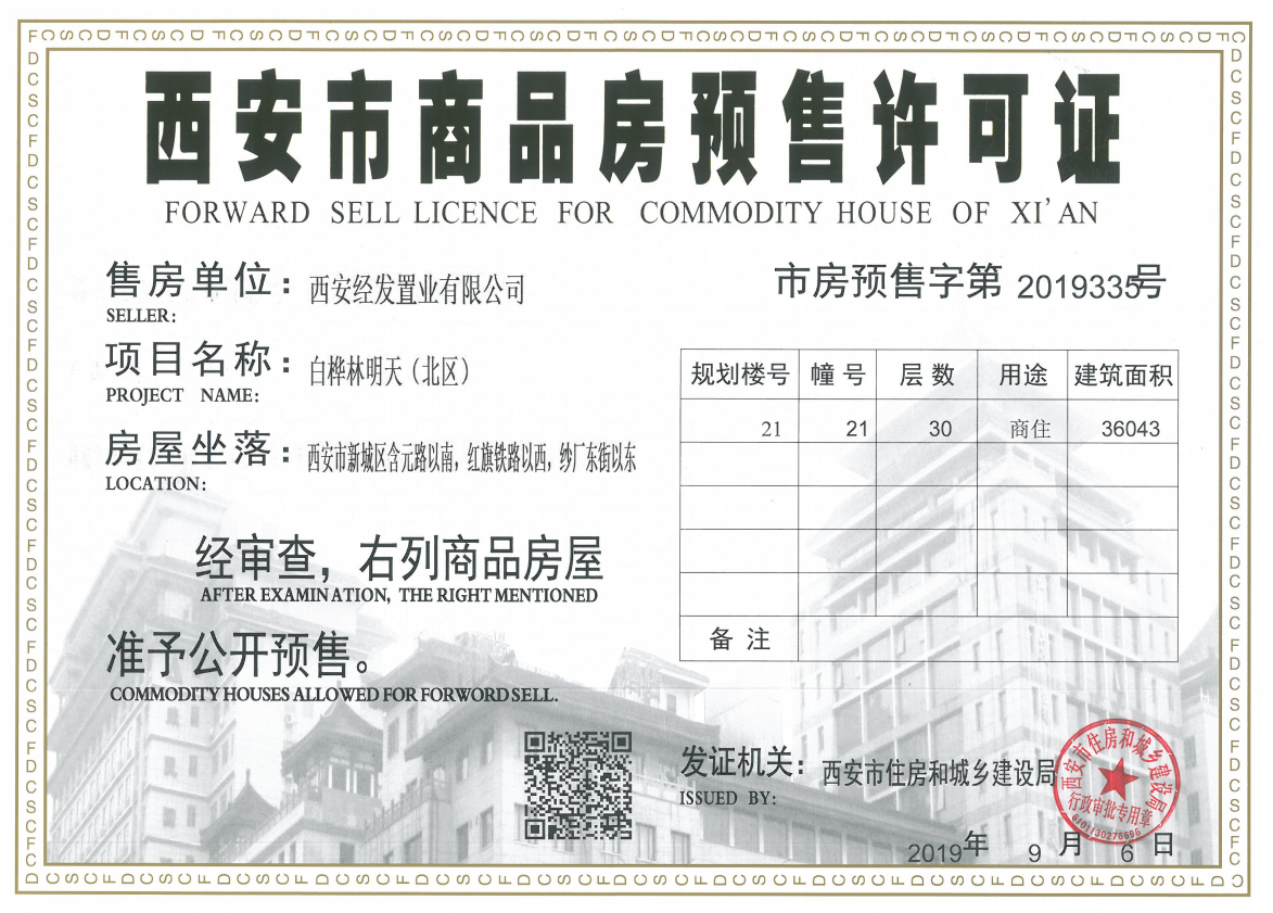 - 市房预售字第2019335号 详情发证时间 2019-09-06绑定楼栋21#证件照片