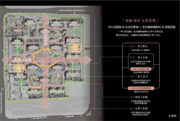 采撷学府之韵,遵循生态自然,勾勒两环两轴五境。中心花园+礼仪归家纵横双向景观轴线、生态健康慢跑环+游园环廊双环构架、辅以全龄交互的5重景观园林,互相链接,层层渗透,全境活力共融,礼献一部书苑式美学奢隐样本。
