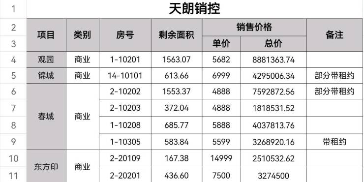天朗大兴郡春城,三层1-10305号,面积583.84平,一口价5599元/平,带租约,租金35元/平