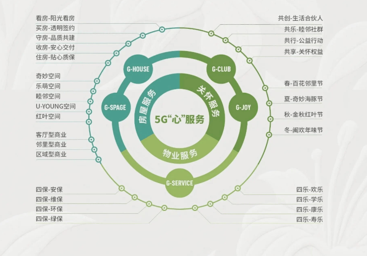 @G-SPACE: 全龄园区配套,让生活更有温度◎G-CLUB:绿城会,融洽和谐的邻里圈子◎G-JOY: 春夏秋冬,四季丰富的园区活动◎G-SERVICE: 精细化、可持续、全天候的园区服务
