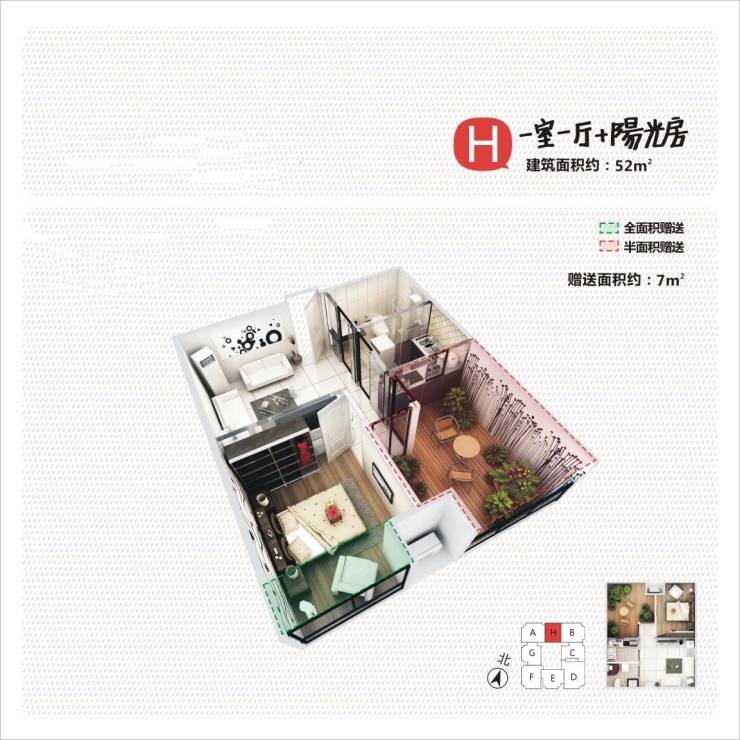 1.建筑面积:52㎡ / 1室1厅1卫