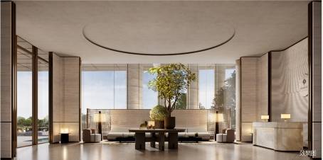 建筑线条从梧桐树冠中提取灵感,采用现代设计经典的体、块、面语言,-通过纵向线条构成其向上的生长姿态,弧形倒角元素赋予整体稳重典雅的形象气质。米白、深灰、暖灰颜色搭配简洁且主次分明。充满向上的张力。