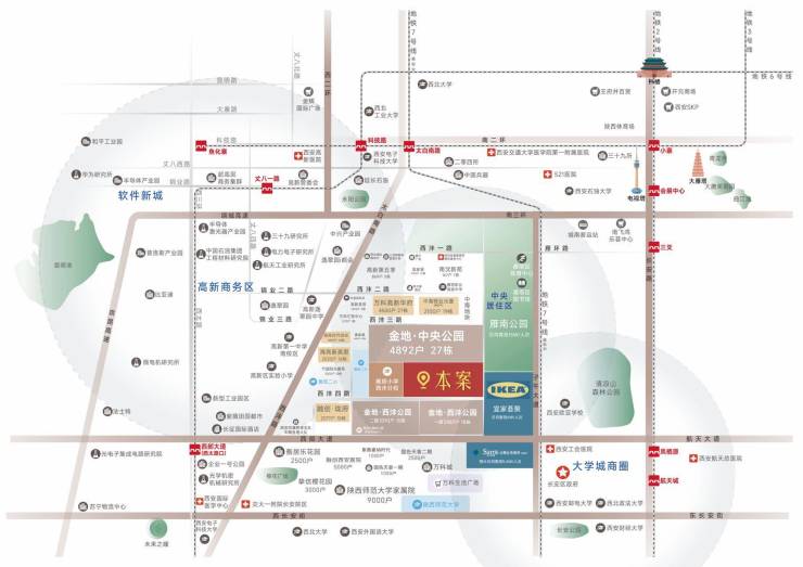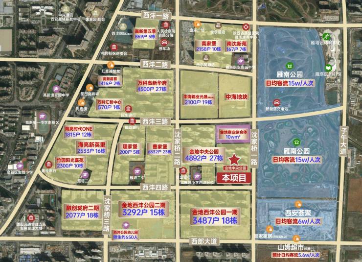 本项目位于高新、雁塔、长安三区交汇核心的西沣板块上,北临电子城、西临高新产业区,向西北可直达锦业路核心商务区,南临长安大学城,东临子午大道,途径西部大道向东可深入曲江CCBD,西南侧触及高新三期中央创新区CID,属于城市中央居住区!周边2公里范围内,金地中央公园(4892户 27栋)金地西沣公园一期(3487户 18 栋)、金地中央公园二期(2515户 14栋)、金地.西沣公元二期(3292户 15栋)、中海锦业元晟(2100户 19栋)、融创珑府(2077户 18栋)、万科高新华府(4500户 27栋)、海亮新英里(2533户 16栋),区域内常驻人口可达12w+,开门即客流,吸纳财富,一路发铺!