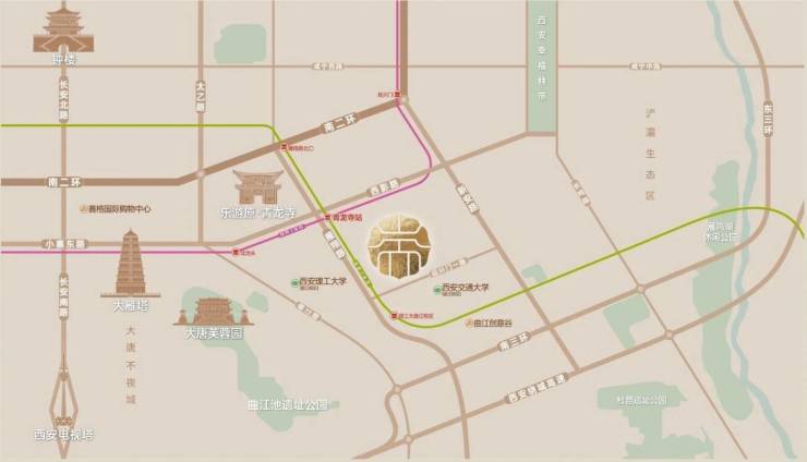 约5公里范围内可享西安市第九医院、武警陕西省总队医院、西京医院、西北妇幼儿童医院曲江院区等三甲医院,全龄医养需求尽可承载,