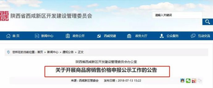 2018年7月13日,陕西省西咸新区开发建设管理委员会办公室发布《陕西省西咸新区开发建设管理委员会办公室关于开展商品房销售价格申报公示工作的公告》。公告规定: