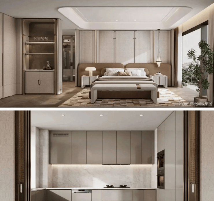设计以柔美弧线贯穿空间,浅色石材与水墨纹理奠定雅致基调,金属细节点缀东方韵味。线条与造型融合韵律与精致,在当代风格中注入文化仪式感