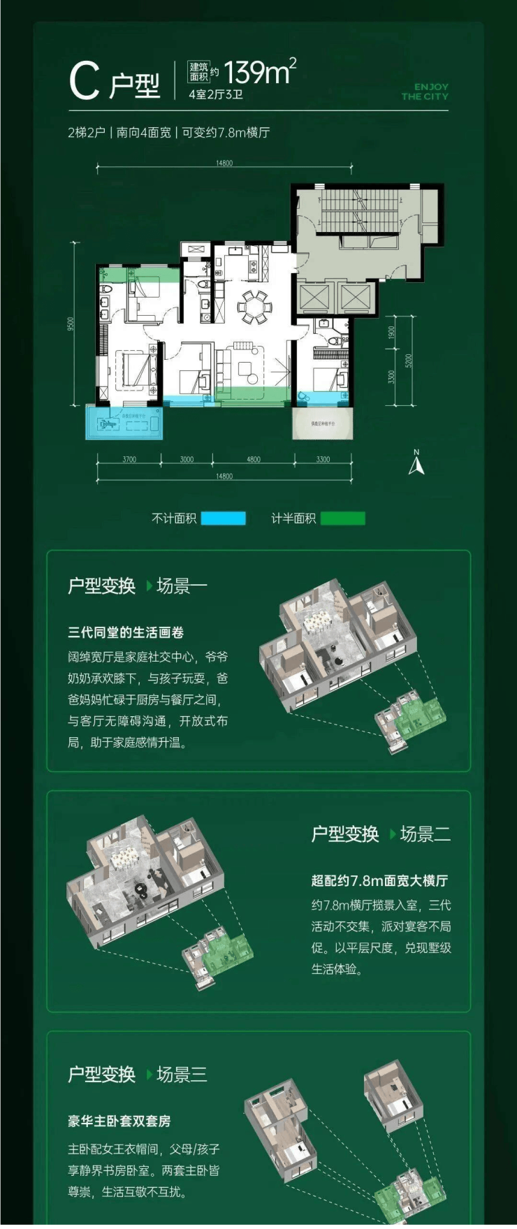 建筑面积约:108㎡、126㎡、139㎡2T2四代宅