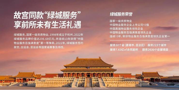 绿城服务,国家一级资质物业,连续13年获得“中国物业服务百强满意度”第一等殊荣。北京故宫、杭州亚运会、西安全运会同款物业,享受前所未有的礼遇。