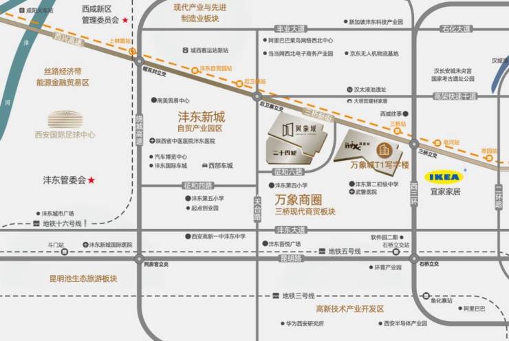 万象城、万象润街资源共享,构筑成更加完备的万象商业集群,形成以商务、购物、生活等多中心组团的商业生活领地。周边汇聚四座专业市场宜家家居、大明宫建材家居、恒大城市广场、西部车城,项目周边医疗资源及教育资源也极为丰沛,未来将带来完美的生活体验。